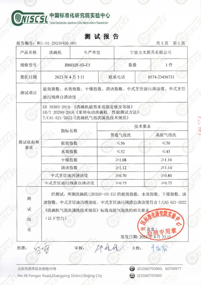 2022年,方太联合中国家用电器研究院发布首个《洗碗机气泡洗清洗技术规范》,此次举办的媒体沟通会上,方太水槽洗碗机新5系又通过了中国标准化研究院完成技术验证,经由严苛的技术测试和实效检验,测试结果最终为,能效指数50、水效指数45、干燥指数1.29、清洁指数1.24、中式烹饪油污清洁度0.87、中式烹饪油污残渣自清洁度0.77,各项指标均符合要求,其中干燥指数、清洁指数均高于国家一级水效标准基数,且对中式烹饪油污的清洁效果显著。