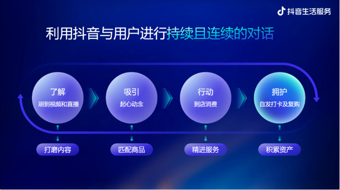 用户从第一次刷到你的视频和直播,到起心动念,到第一次去店里消费,然后自发打卡传播,再到产生复购,最后成为一个终生用户。在这个全部过程,你都可以用抖音来和用户进行对话。我们希望这种对话是持续的、是连续的,而不是一次性的。只有这样,生意才会有长期的回报。譬如有一个自助餐饮客户,深度运用了抖音线上经营数据为他们的新店选址、餐品升级、商品预售等环节提供指导,各门店都做了常态化内容经营,一个月视频有30多条,直播50多场,形成一条良性循环的经营链路。客户从入驻到现在,生意已经实现了一千多倍的增长。