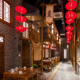 鲁巷乐坊是集非遗民俗、鲁味美食等特色于一身的民俗体验式餐厅韵味十足、古色古香的齐鲁传统街巷场景青砖黛瓦,灯笼高挂,中式的四方桌椅眼到之处,满满的地道鲁味特色