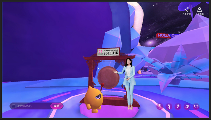 同时,本次上市发布会首次采用虚拟人担任主持人,花房集团的首个虚拟人IP上古玄儿带领大家从敲钟现场一同进入FUNVERSE,探索了一个蕴含着未知和惊喜的世界,展示出新一代社交娱乐场景的无限可能性。