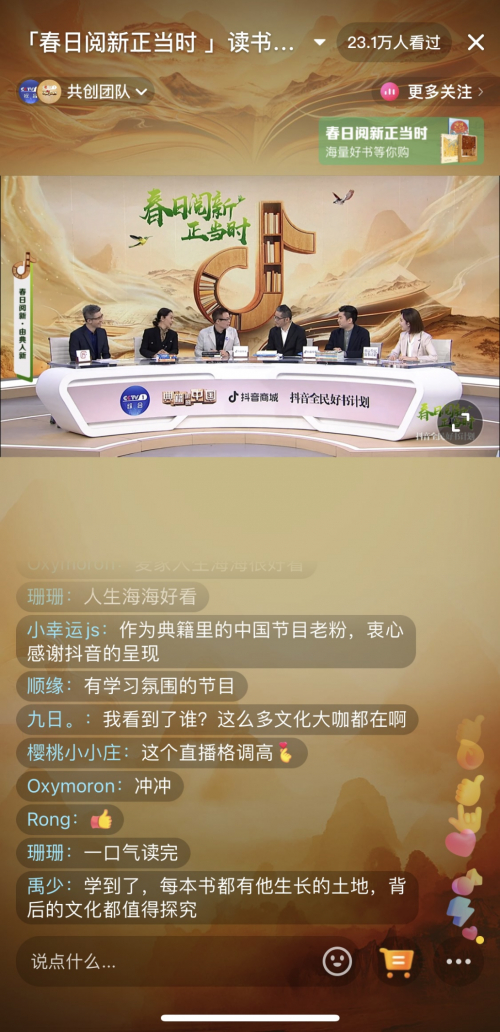 在为人们创造更符合大众阅读习惯的场景时,以抖音电商为代表电商平台还以强互动交流的特性进一步放大阅读的趣味性。抖音电商打破了时空的限制,让阅读成为所有人都能够参与的狂欢派对。无论是专家学者,还是普通读者,任何用户都可以在平台上产出内容并通过评论区与其他用户进行互动,在真诚交流中相互影响、相互启发,碰撞出新的思想火花。在这里,阅读始于读,但不止于读。