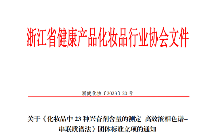 日前,浙江省健康产品化妆品行业协会发布公告称,根据《团体标准管理规定》规定,由花西子母公司杭州宜格化妆品有限公司牵头、多家知名企业和机构参与申报的《化妆品中23种兴奋剂含量的测定 高效液相色谱-串联质谱法》团体标准,经浙江省健康产品化妆品行业协会组织专家于2023年4月24日进行立项评审,获批准立项。
