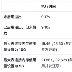 在执行这些操作期间,如果运算符使用的内存量超过了配置限制,会自动将数据落盘并继续进行后续处理。为了说明目标工作负载受影响程度,我们模拟了决策支持系统,使用 TPC-H 基准测试工具进行测试,结果如下表所示: