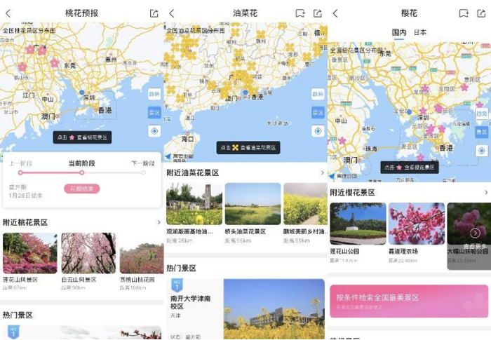 五一假期也是赏花的好时节。在这个美好的假期里,去观赏国内最美的花海,放松心情,感受大自然的魅力也是不错的选择。墨迹天气“花期预报”功能综合花卉周期、气候变化特征以及地理区位因素等数据对花期信息及生长状态进行分析,可为用户提供实时的花卉观赏指引。通过该功能,用户可快速查看全国各地油菜花、樱花、桃花的花期和热门赏花景点,合理规划好赏花路线和出行时间,让旅行更加便捷和愉悦。 除了当下热门的“花期预报”,墨迹天气的旅游预报权益还可针对不同季节的旅行热点,为用户提供诸如星空预报、枫叶预报、滑雪预报等特色服务,让用户更好地了解目的地的观景情况,享受更好的旅行体验。