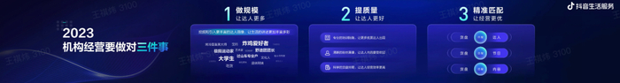 刚才时雨介绍了抖音生活服务业务2023年的经营主题,机构作为主要角色之一,也在整体生态中发挥着重要作用,接下来我将介绍一下2023年机构板块的策略,及未来的发展方向,期望我们一起助力好生意。