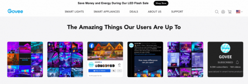 同时其官网也专门展示了消费者在社交媒体平台分享的Govee智能照明案例,并且直接链接到Govee各平台的社媒主页,可见其在社交媒体平台上通过UGC美图和视频展示产品炫目效果的策略。