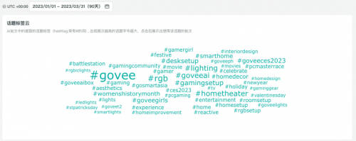我们通过OneSight营销云的“帖文内容流”功能,集中查看了Govee所有社媒主页在Q1采用的高频话题标签: