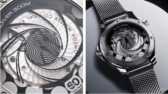 一只欧米茄海马系列300米腕表居然在机芯上做出“动态画面”,这是“活动人偶”吗?当然不是。这一标志性的电影镜头采用微结构金属镀层制成,并在蓝宝石玻璃表背之下呈现出动态效果。欧米茄在机芯底部,巧妙地使用一个转动的铝盘,在铝盘上,有4帧人物画面,以及黑白相间的螺旋。铝盘通过秒针带动旋转,旋转起来后,4帧人物画面,连续起来,就有动态效果了。手表秒针一直走,动画效果就会不停播放,周而复始。