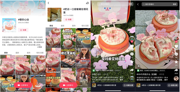 KUMO KUMO在内容发布上,会对达人进行精细化分层级运营,让品牌不止有大范围声量,也同时收获了下沉市场的消费人群。首先会对不同类型达人进行招募组合,使用内容达人+团购达人的组合式招募策略,头部内容达人负责引爆新品热度的任务,而团购达人则承接新品流量快速打爆新品。将蛋糕融入不同春日出行场景里,策划热点话题#樱你心动 #把这一口甜蜜藏进樱花里,两个话题吸引众多超头部达人自发发布相关内容视频,双话题视频播放量3600w+次,实现高效传播目标。