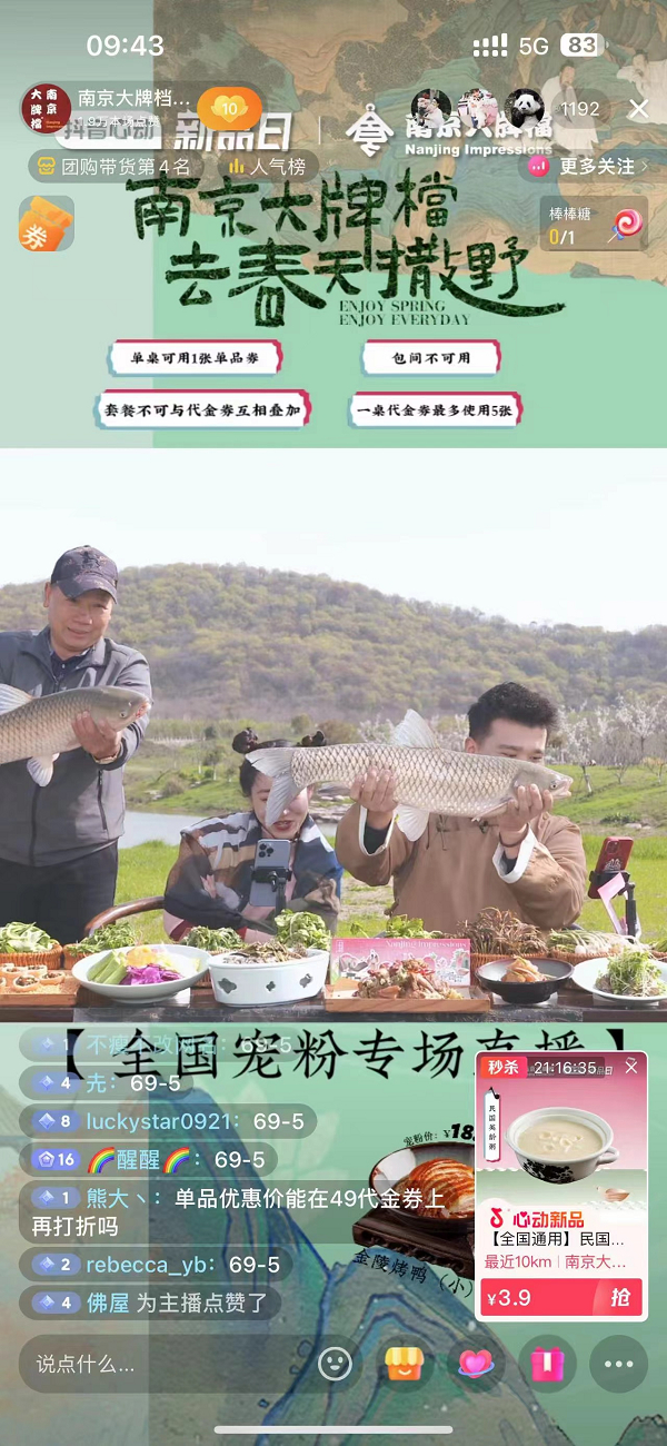 除用优质短片吸引用户关注之外,南京大牌档还推出了全国宠粉专场直播。该直播场景设立于户外郊野,湖泊、草地、远山及盛开的桃花等美景跃现于镜头之中,有力增强了直播间“去春天撒野”尝鲜的氛围。同时,本场直播也不仅局限于推广品牌新品菜单,而侧重于向观众普及如何鉴别“七头一脑”等与菜品相关的干货信息,并融入苏州评弹、飞花令等充满南京文化特色的内容和互动。
