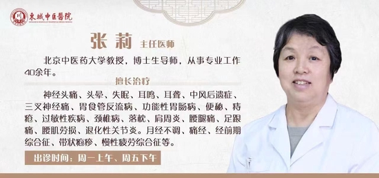 张莉,主任医师,东城中医医院特聘专家,出诊时间周一上午、周五下午。北京中医药大学,教授,博士生导师,从事专业工作40余年。擅长治疗:神经头痛、头晕、失眠、耳鸣、耳聋、中风后遗症、三叉神经痛、胃食管反流病、功能性胃肠病、便秘、痔疮、过敏性疾病、颈椎病、落枕、肩周炎、腰腿痛、足跟痛、腰肌劳损、退化性关节炎。月经不调、痛经、经前期综合征、带状疱疹、慢性疲劳综合征等。