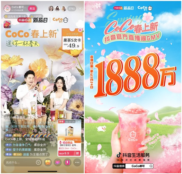 在一片粉红海洋中,CoCo都可联合抖音生活服务「心动上新日」IP推出“樱花粉荔”系列新品,包含樱花粉荔、樱花粉荔满满、樱花粉荔拿铁咖啡三款饮品,各自不同的口味面向不同的目标人群,樱花的淡淡香气与荔枝果肉的清甜相结合深获用户好评。CoCo都可通过推出应季新品,借势平台级IP放大产品关注度,实现快速出圈,触达更多用户。