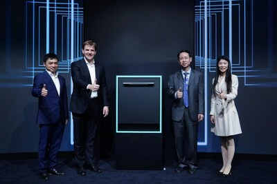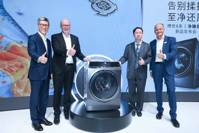 博世8系洗干一体机及发布现场 (从左到右:博西家用电器集团大中华区高级副总裁兼首席财务官宋凛冰先生、博西家用电器集团董事会主席兼首席执行官迈致远博士、中国家用电器协会副理事长朱军先生、博西家用电器(中国)有限公司洗涤产品事业部副总裁李智先生)