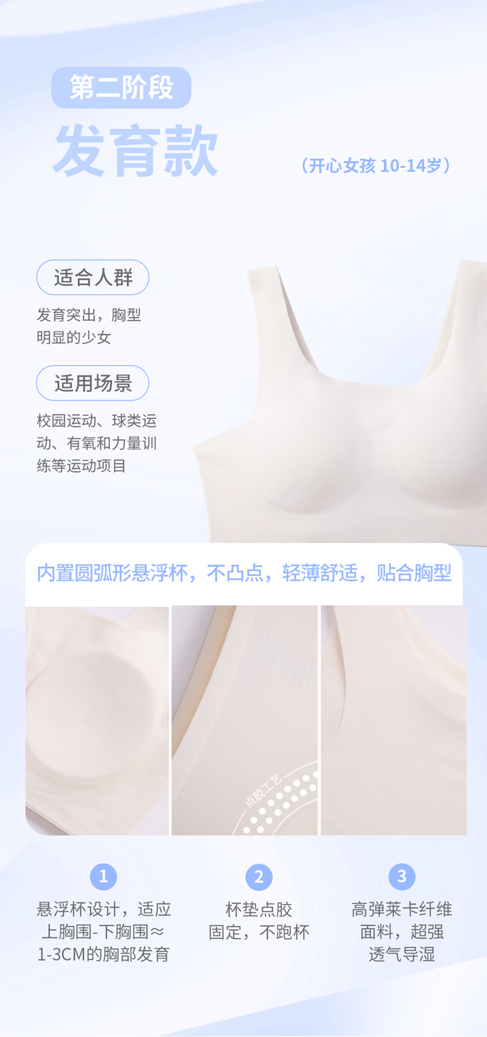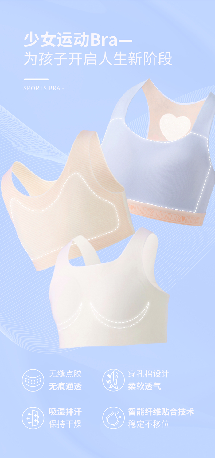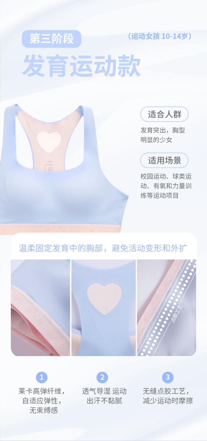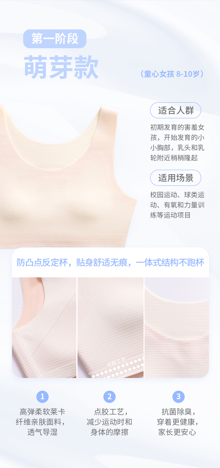 针对8-10岁初发育阶段,主打无痕舒适轻盈肤感。全件一体式设计无车缝,使用点胶工艺,大大减少与皮肤的摩擦感,保护这个阶段娇嫩敏感的肌肤;面料采用高弹莱卡纤维,前胸覆盖穿孔透气棉杯,像第二层皮肤一样质感柔软,轻薄透气不凸点。