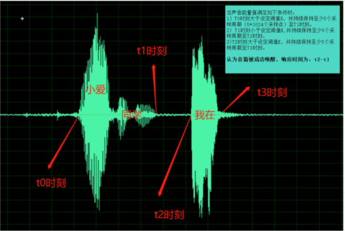 利用这种产品特点,开发了基于全双工声音能量阈值检测程序,实时采集并监测音频能量值,结合语音端点检测及双门限的能量阈值判断算法,自动获取智能音箱的唤醒结果。