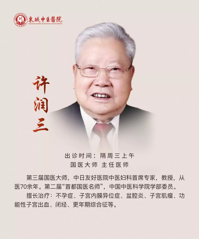 作为极具影响力的妇科大家,许润三教授的出诊也为东城中医医院妇科的师资再添力量。妇科是该院重点科室之一,自建立以来坚持突出中医特色,走中西医结合治疗之路,凝聚中医科学院、北京中医药大学、北京中医药大学第三附属医院、东方医院、北京妇产医院等众多著名妇科专家出诊,其中包括国家名老中医牛建昭教授、王希浩教授,首都国医名师吴育宁教授,首都名中医康佳教授,北中医三附院原妇科主任刘昭阳教授,国医大师柴松岩学术继承人濮凌云主任、黄玉华主任,首都国医名师肖承悰学术继承人刘雁峰主任、朱梅主任,国医大师王庆国学术继承人武晓冬主任等,在学术及临床方面可谓齐头发展。