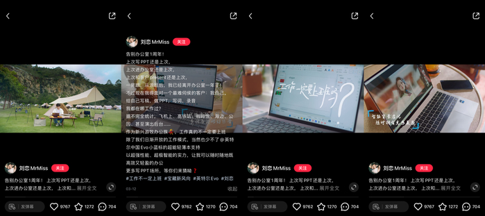 这场解读以短片形式呈现,由明星刘恋带头演绎,作者林安观点背书,@三多同学、@童解和@王秋怡秋秋等数位职业KOL多场景深度展示,以「走出写字楼、解锁办公新姿势、沉浸式居家办公」等多角度种草,持续深化用户对英特尔新品Evo超能轻薄本的产品认知。