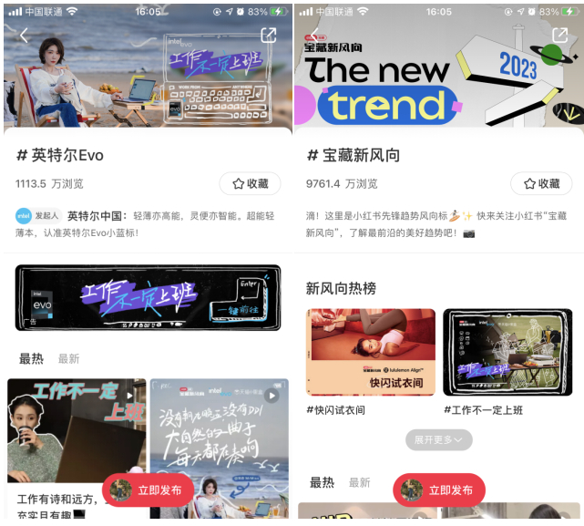 站内用户可以在长线IP「宝藏新风向」话题页和品牌#英特尔Evo#活动话题页浏览活动H5,双话题页互相导流,联动效果升级,达到品牌高效种草。