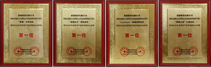4月20日,由中国商业联合会、中华全国商业信息中心联合主办的“2023中国消费品市场发展大会暨第三十一届中国市场商品销售统计结果发布会”在北京召开,会议发布了2022年度中国市场商品销售统计结果。时至今年,爱慕股份旗下“爱慕”女性内衣已连续7年荣列同类产品市场综合占有率第一位,“爱慕先生”男性内衣已连续6年荣列同类产品市场综合占有率第一位,“La Clover”高端女性内衣已连续11年荣列同类产品市场综合占有率第一位,“爱慕儿童”儿童内衣虽是首次参与评比,同样也荣获桂冠。