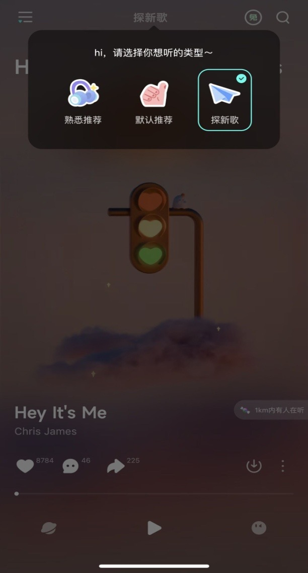 用户只需点击顶部“推荐”,选择“系统默认推荐”、“熟悉推荐”或“探新歌”三种方式,系统便会按照用户喜欢的推歌方式播放歌曲。