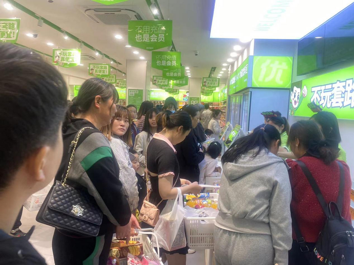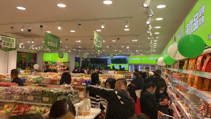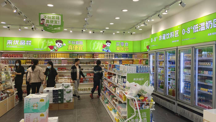 来优品仿佛“一夜之间多店齐开”形成“规模效应”,来优品店铺十几米长的门头,超人IP醒目,品牌绿色亮眼,在一众商铺中显得尤为抢眼。
