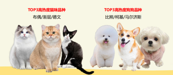 ● 猫热度领先狗热度:从行业声量出发,站内猫狗热度比重大约是5:3,撸猫党胜出,猫咪和狗狗也有各自的重点品种。