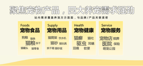 ● 四大养宠需求强劲:宠物食品、用品、健康和服务,四大需求覆盖养宠方方面面。不同的细分需求下也有各自的特征,比如食品需求中,猫粮搜索热度非常高,幼猫粮和烘焙粮成为新的关注热点。