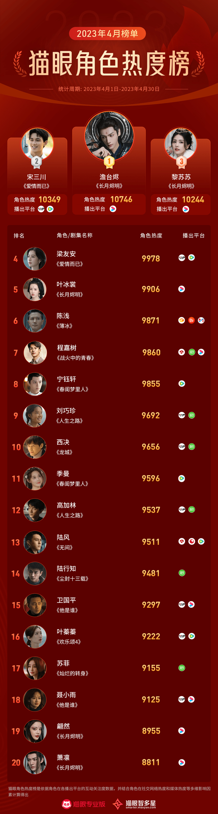 2023年5月,猫眼专业版发布了《2023年4月剧集热度榜单》及《2023年4月猫眼角色热度榜》,榜单均根据4月上线剧集在各主流视频平台的播放数据,并结合社交网络互动热度和媒体热度等多维度影响因素计算得出。