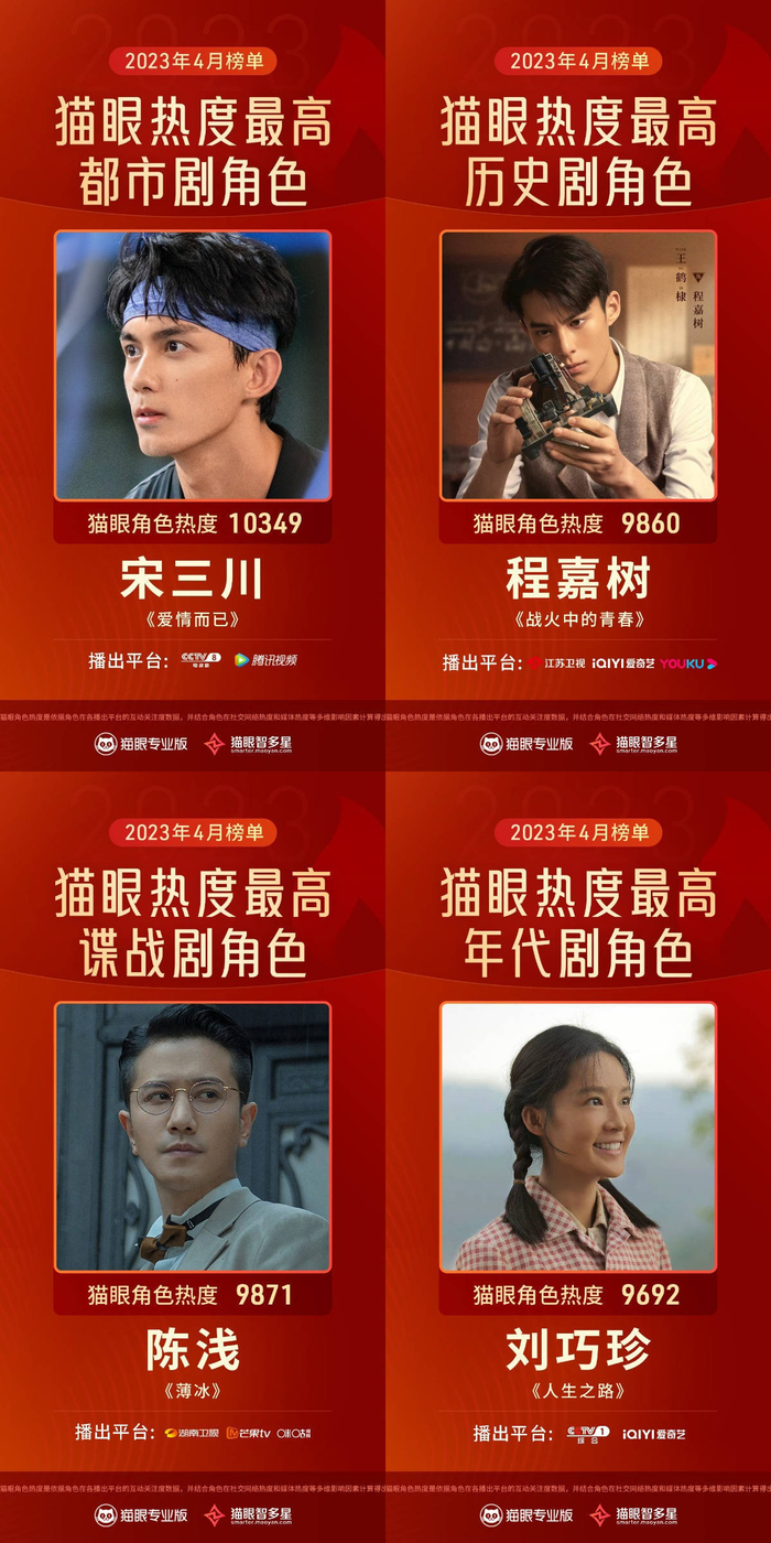 2023年4月猫眼最热谍战剧角色和年代剧角色则分别由《薄冰》中由彭冠英饰演的“陈浅”和李沁在《人生之路》中饰演的“刘巧珍”摘得。