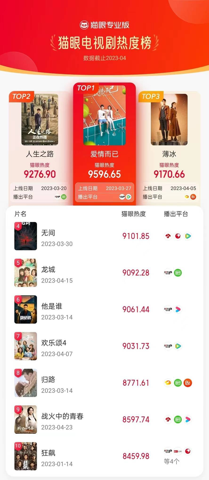 根据猫眼专业版数据显示,2023年4月电视剧热度榜前三名分别为:《爱情而已》、《人生之路》和《薄冰》。其中吴磊、周雨彤领衔主演的《爱情而已》以9596.65的猫眼热度位居榜首,该剧同时还是2023年4月都市剧热度冠军。陈晓、李沁等主演的《人生之路》和彭冠英、陈钰琪等主演的《薄冰》分别以9276.9、9170.66的猫眼热度获得电视剧热度榜亚军和季军。