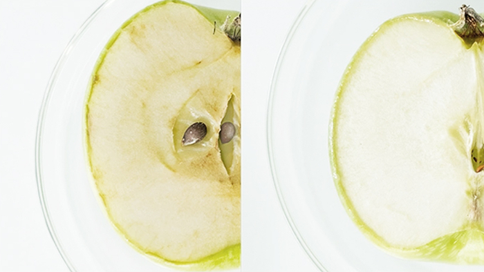 左图对照组为苹果自然氧化结果,右图实验组为添加脱羧肌肽拦截糖化效果呈现。