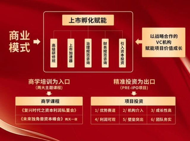 不同于大部分同行,天成的核心业务在内部做了一次闭环:通过自己的商学培训板块,筛选“未来独角兽”优质项目;然后再以上市公司的视角,携手专业机构共同孵化;最后再陪跑企业完成融资上市。三级业务结构,组成了天成最核心的商业模式。