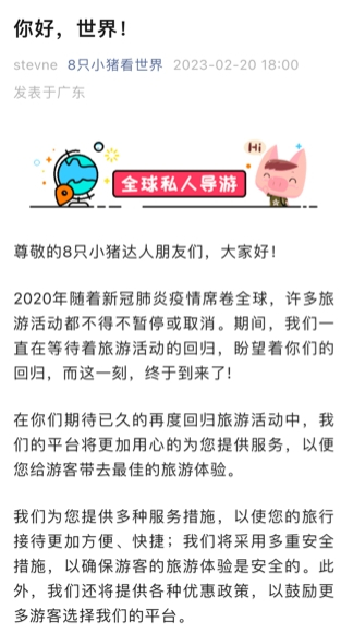 谈及为何在今年能够快速恢复服务,,8只小猪负责人说,一方面是创始团队始终密切关注旅游、特别是出境游市场的复苏。同时在疫情到来前,公司现金储备充足,项目盈利状况也已得到市场检验和投资人认可,唯一要做的就是等待市场复苏。而在今年初全面放开的大背景下,公司也能够迅速恢复至疫情前的服务状态。