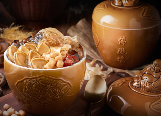 佛跳墙是闽菜经典代表之一,“一贯好鲍”佛跳墙精选南日鲍鱼、刺辽参,搭配鱼唇、蹄筋、元贝、花菇等,传统闽式熬制,汤如茶色,清澈澄亮。闽式原汤与食材融为一味,食材之间相互渗透,入口既有共同的荤味,又保持食材本身独特的风味。