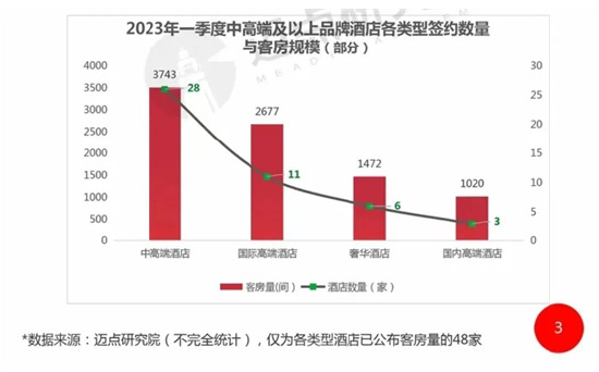 笔者在巡回观展过程中发现,各大酒店集团多是携多品牌发展、而且中高端品牌已成为集团拓展主力品牌。这一现象,与迈点研究院发布的《2023年第一季度全国中高端及以上品牌酒店签约统计报告》数据不谋而合——中高端酒店签约数量占比最大。