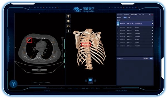 肋骨骨折是胸部创伤中的常见疾病,近年随着高能量创伤的增多,其发生率明显上升。外伤性肋骨骨折患者临床症状通常表现为胸痛、骨折、气胸、血胸等症状,使患者生命安全受到严重威胁。CT是目前肋骨骨折影像学检查的重要方式。近年来人工智能技术辅助CT骨折影像诊断提供了更快速精准的解决方案,特别是在一些隐匿性骨折及因骨折引起的其他肺内受损的诊断,人工智能技术都发挥了积极的作用。本次获批的骨折CT AI产品是深睿医疗胸部CT AI解决方案的第三张NMPA三类证。3张三类证的获得助力深睿医疗胸部CT AI解决方案完美实现基于胸部CT成像的一站式多征象、多病种的AI辅助诊断,通过一次胸部CT扫描,AI同时分析肺窗、骨窗、纵隔窗,对肺结节、肺炎、其他肺部疾病征象、骨质病变和纵隔病变等提供一站式检出。系统为多任务模型,具备定位检出、定量分析、定性分析、智能随访和结构化报告等功能。肺窗、骨窗、纵隔窗三窗联动,无缝切换,一扫多查,完美应对各类胸部疾病的精准诊断,为医生提供更为快速、精准、便捷的AI辅诊工具。
