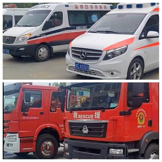 停靠在街头为旅游烧烤待命的救护车车队、消防车车队