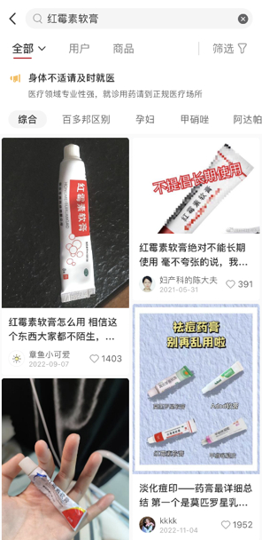 除了联合专业医生进行辟谣,小红书还会对用户进行医疗风险提示,比如当用户搜索药品时,系统会判定私服药物具有一定风险性,因此对用户主动提示“医疗领域专业性强,就诊用药请到正规医疗场所”。