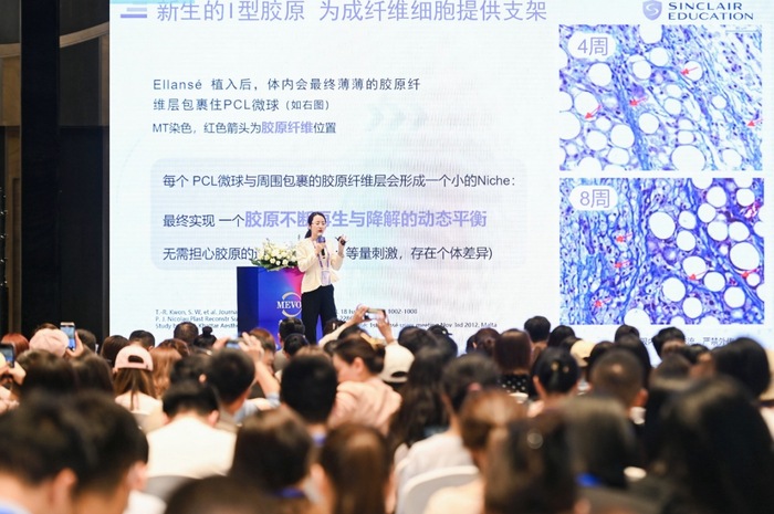 针对Ellansé伊妍仕激活胶原新生的原理,南京华美美容医院院长吴文欢分享到:“PCL材料可以自然代谢,且因为每个 PCL微球与周围包裹的胶原纤维层会形成一个小的Niche,最终实现一个胶原不断再生与降解的动态平衡。”