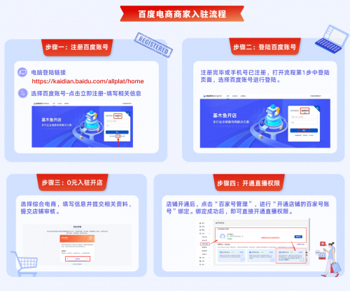 商家只需要通过四个简单步骤即可低成本便捷入驻,开启百度直播电商之旅。首先,在电脑端登录百度基木鱼开店页面,注册百度账号,然后,用该账号登录,其次,选择综合电商,填写信息并提交相关资料,即可0元入驻开店,最后,在店铺开通后,进行“开通店铺的百家号账号”绑定,绑定成功后便可开通直播权限。