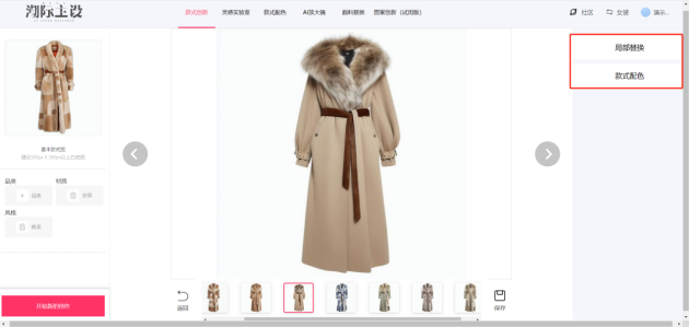 AI生成的过程不超过一分钟,点击加号可以持续创作款式,直到产出能够符合设计师想要的时装,点击大图,可以发现,另外的两个功能“局部替换”和“款式配色”,它们可以对版型进行深度加工调整。