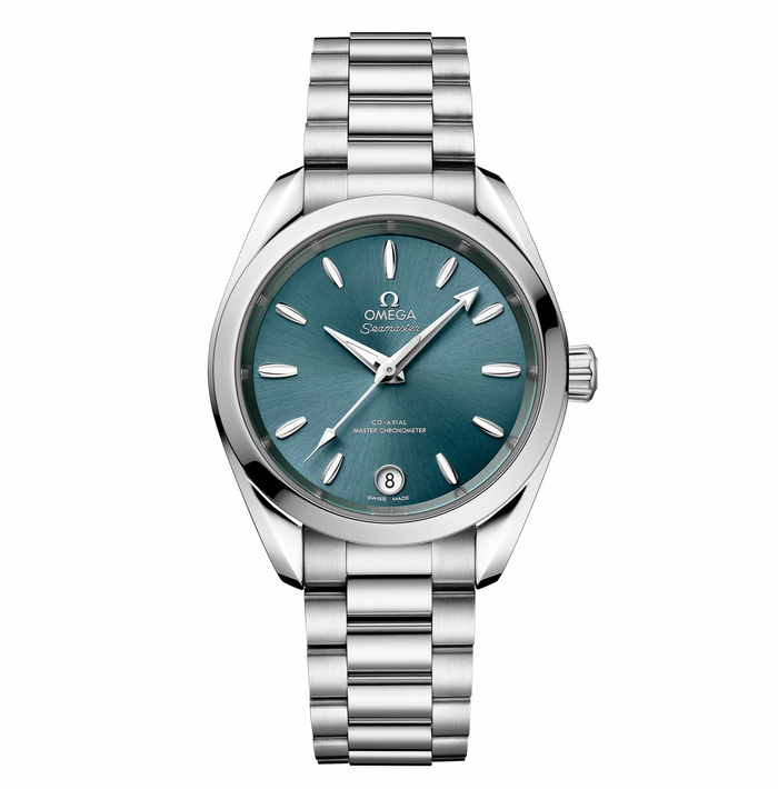 其实,选择这款绿色盘面表的一大好处,就是很方便搭配各种不同的女表款式。比如这只海马系列 AQUA TERRA 150米34毫米至臻天文台表 ,小一点的尺寸更加适合女性的需求。同样向欧米茄辉煌的海洋传奇致敬之作,设计风格一致之外,又有小细节的变化:其湖绿色表盘色泽雅致而独特,是由黄铜制成,经过漆面处理,由中央向四周呈现出太阳射线的打磨效果。6点位设有日历窗,指针、小时刻度和欧米茄品牌标识均以抛光白色18K金制成,细看之下妩媚性感动人。