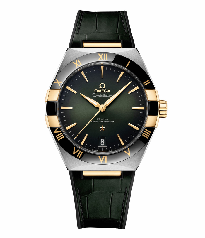 记得多年之前,曾经对一款盘面黑中泛绿的古老欧米茄星座有过浓厚的兴趣,当时对它的状态有点犹豫,结果没有买下。当我看到这款新星座系列41毫米至臻天文台 ,钢壳配上抛光黑色陶瓷表圈以及粗壮的黄色18K金「托爪」,让人看到了星座的全新面貌。绿色表盘呈现出太阳射线打磨效果,偏深的配色,给人稳重而温暖的感觉。由 OMEGA Ceragold® 技术制成的罗马数字时标,以及同样金色的时分秒三针,在绿色盘面的衬托下显得格外醒目。