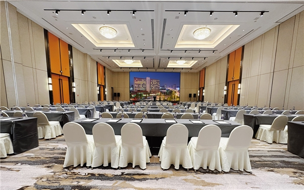其中,宴会前厅天花板的镜面设计,映照着中国传统山水图纹地毯,营造空间的艺术氛围;宴会大厅宽敞明亮,橙色点缀带来活跃灵动氛围,彰显轻奢尊贵感受;会议室以灰色为主调,风格简约,强调高级感和现代气息。