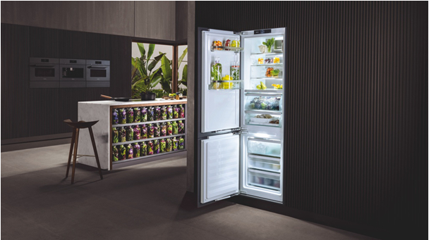 美诺嵌入式冰箱,灵感锁鲜, Perfect Fresh动态保鲜控温系统让食材快速冰鲜,让食材延长保鲜5倍之久。搭载的全新CleanSteel易洁金属背板,在易清洁及防冻结的同时,可均匀冷气分布,提升制冷效率。