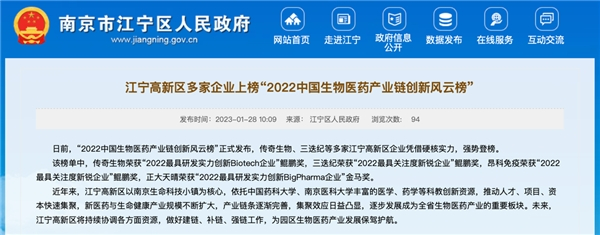 2023年1月,在由中国生物医药产业链创新与转化联盟(CBIITA联盟)主办、南京生物医药产业创新转化中心与《药学进展》编委会支持的第二届中国生物医药产业链创新与转化高峰论坛上,“中国生物医药产业链创新风云榜”正式公布。在会上,总部位于南京的金斯瑞旗下子公司传奇生物荣获“2022最具研发实力创新Biotech企业”鲲鹏奖。