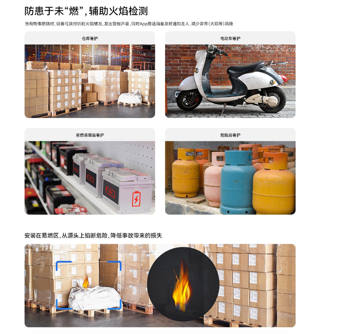 国际消防技术委员会的一组数据显示,每年全球发生火灾600万-700万起,大约有6-7万人在火灾中丧命。全世界每天发生火灾1万多起,造成数百人死亡。单单是我国火灾带来的财产损失就有10多亿元。火灾带来的后果不言而喻。那么在家庭当中经常存在一些安全隐患,例如电瓶车充电、家中囤放易燃物品、店铺仓库等等。在智能安全看护领域,华为智选推出小豚当家室外摄像头3K版,支持辅助火焰检测,针对重点区域安全检测和看护。