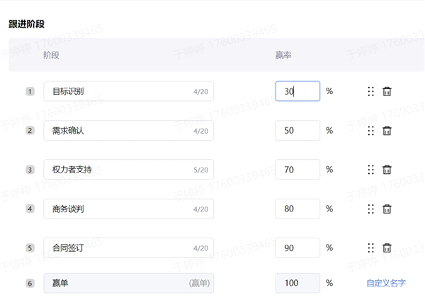 对于销售不按规定及时更新商机阶段,导致管理层无法看到真实业务进展的情况,探马SCRM的商机管理系统,可以根据公司不同的业务线需求,自定义设置商机阶段及赢单率,创建多种销售机会流程。当完成阶段任务后,就可以自动跳转到下一阶段。同时,支持设置是否允许阶段回退、跨阶段跳转,以便针对不同业务实施不同的销售策略。