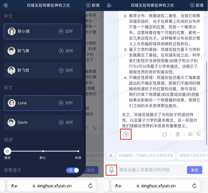 讯飞星火认知大模型目前已支持“语音输入”及“语音播报”功能,用户可以通过语音输入向大模型发起指令,同时点击大模型对话框下方“播放按钮”,即可实现对文本内容的朗读。此外,用户可以在设置选项中切换中英文发音人、调节语速,安卓端用户输入“#spark talking”指令还可以开启纯享语音对话模式。语音输入和播报功能丰富了大模型的交互方式,拓宽了其场景应用的边界,例如在海外旅行时,通过大模型语音输入+内容回答+翻译+播报功能,即可直接完成问路、交流等实际问题。