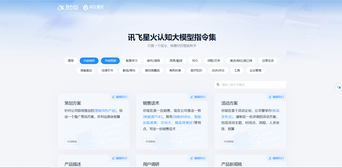 另外,围绕场景化功能体验,讯飞星火认知大模型上线了指令集页面,该页面为用户提供了海量的讯飞星火大模型指令模板,根据不同行业和应用场景分类,为用户提供便捷、个性化的指令参考。例如,教育领域用户可通过该页面快速获得“课程设计”、“学习计划”等指令模板,只需修改关键词即可与大模型快速发起对话。
